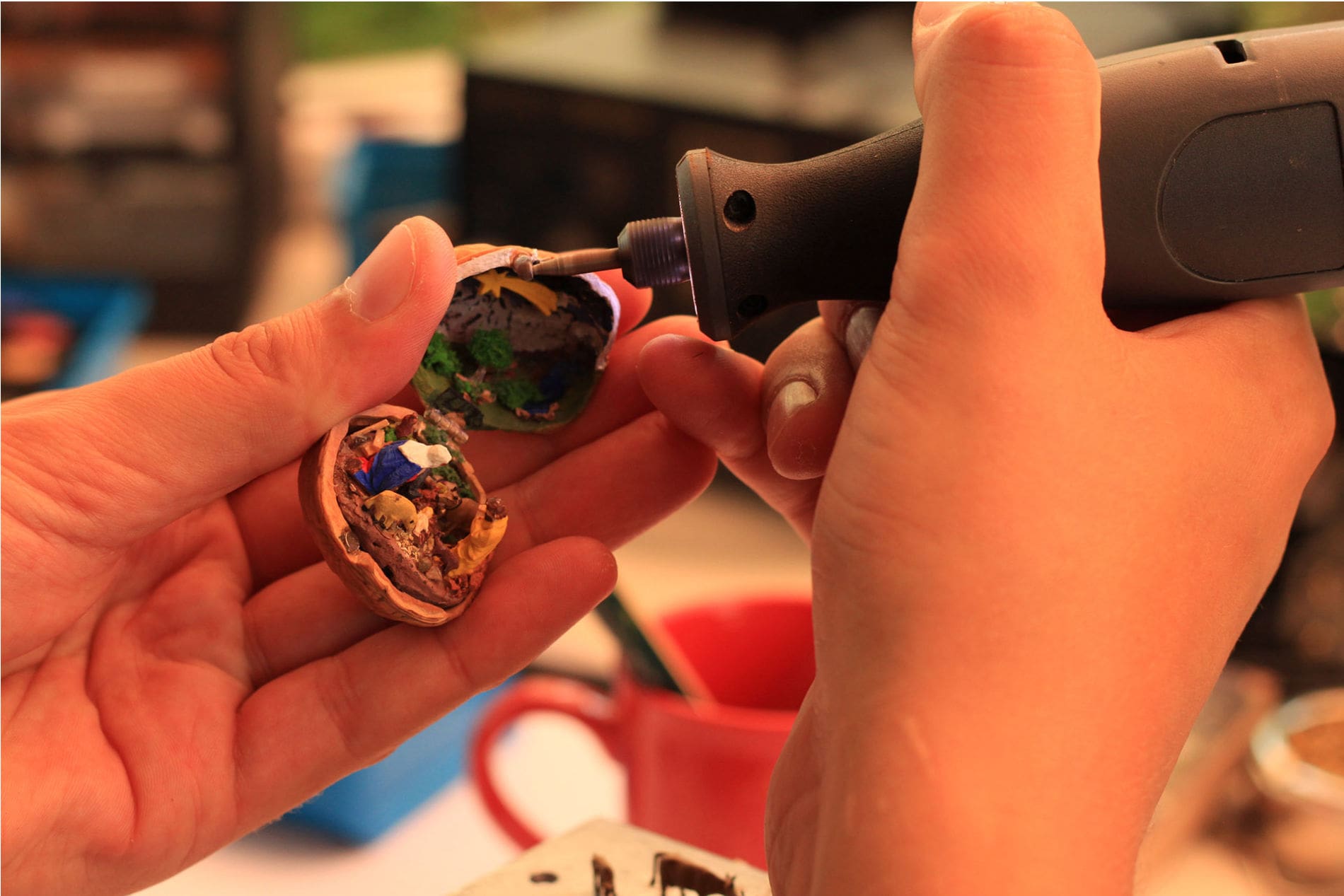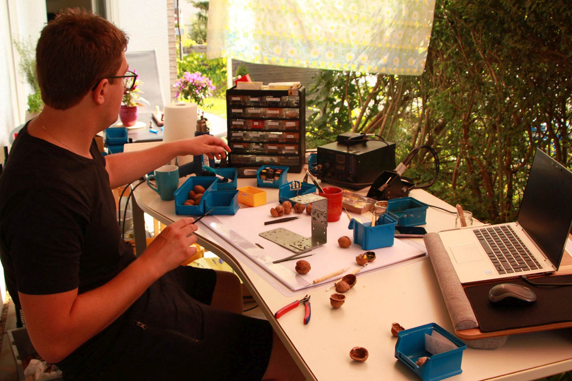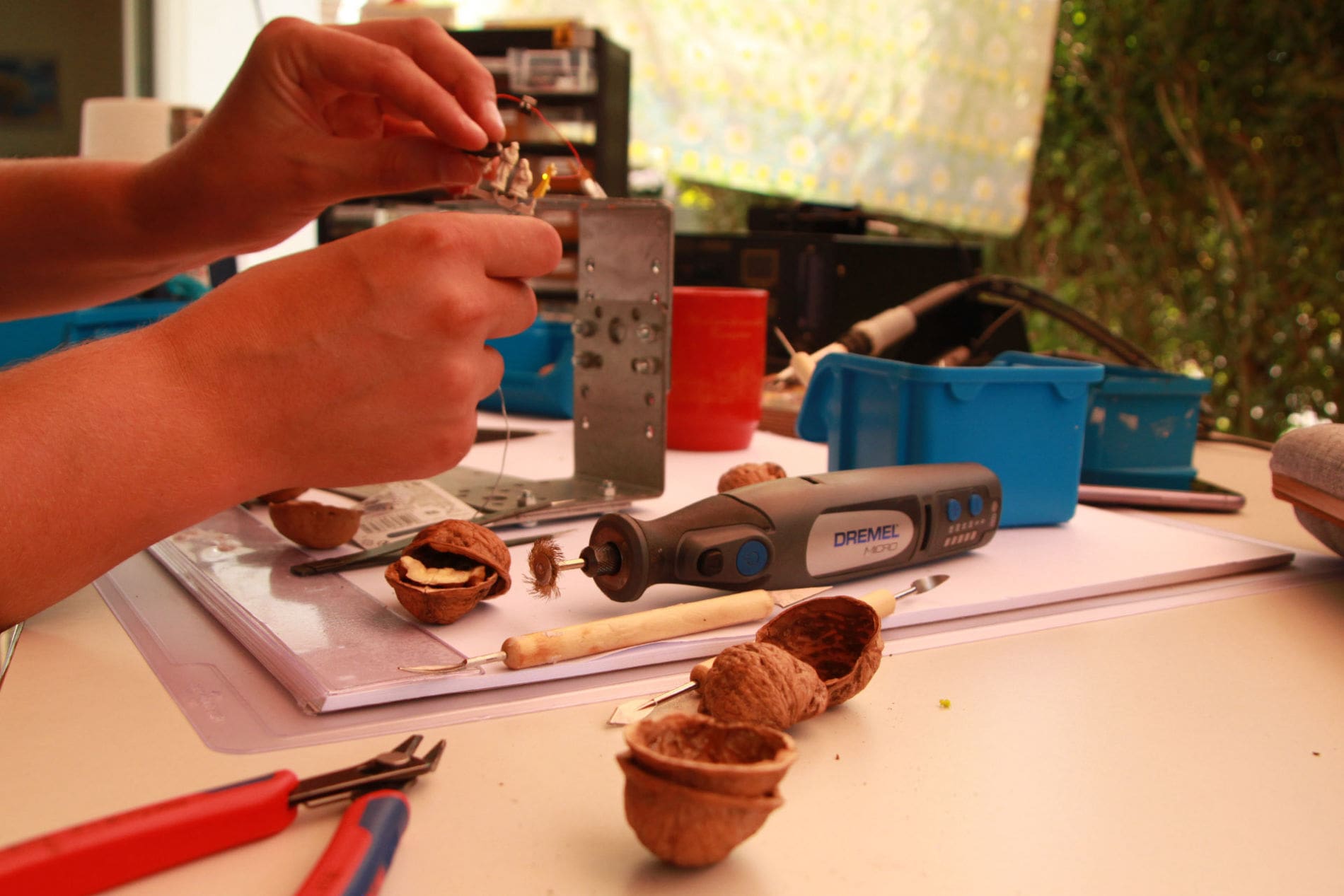 Das Knacken der Nuss hat sich schon als schwierig erwiesen, denn die Bruchkante ging hunderte Male schief. Also habe ich probiert, Nüsse gegessen und weiter experimentiert. Ein Versuch war sie auch mal in Wasser einzulegen, bis sie von selbst keimen und sich dann öffnen. Jedoch ist Geduld nicht meine Stärke und deswegen habe ich mich für das Erhitzen der Schale entschieden. So ist das Material besser zu brechen.